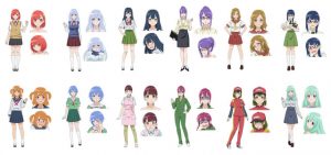 “Dogeza de Tanondemita” Characters’ setting: (from top left)Cast: Gakesaka Minori, Toyofusa Urara, Misenai Kanan, Sukiyabashi Rui, Oosaka Akari, and Murakami Sanami;(from bottom left) Kyan Tama, Shioya Rei, Aneha Yua, Ninose Sannose, Yuuseki Natsumi, and Omoi AyameOgura Yui as Gakesaka Minori, Aneha Yua, and Omoi Ayame, Nagatsuma Juri as Toyfusa Urara and Sukiyabashi Rui, Tomita Miyu as Misenai Kanan and Shioya Rei, Shimizu Ayako as Oosaka Akari and Kyan Tama, Kitamori Saika as Murakami Sanami and Yuseki Natsumi, and Kaida Akane as Ninose Sannose